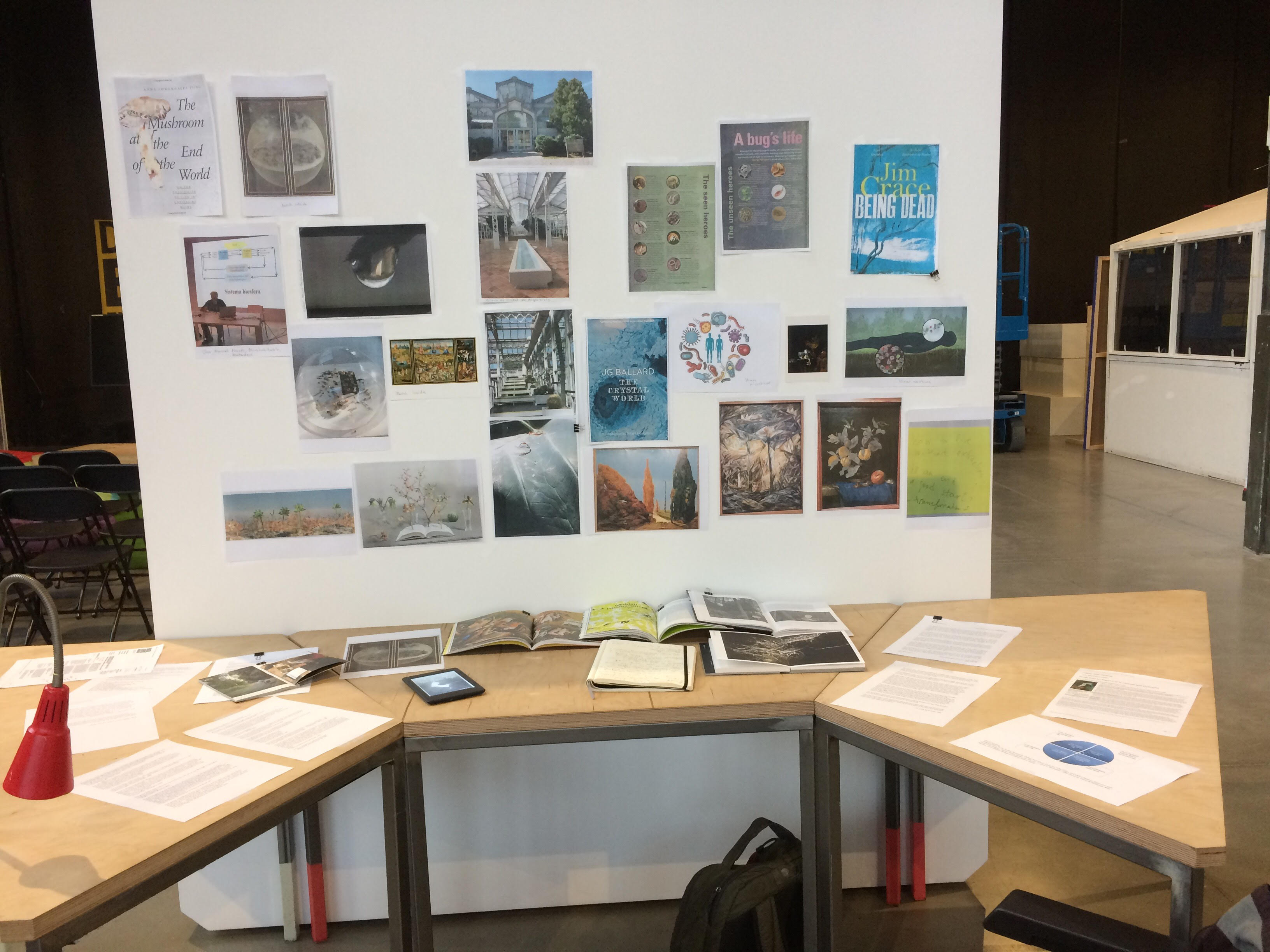 Selected compilation of research process for Microhabitable project: Matadero Madrid – Artists Residency Centre; my studio in Matadero; Palacio de Cristal de Arganzuela; water drops in the tropical zone in Palacio de Cristal de Arganzuela; Jose Manuel Naredo biosphere cycle; Manzanares River; bookshelf; Hieronymus Bosch, The Garden of Earthly Delights, exterior panels, Prado; Leticia Felgueroso, Botanical Gardens x 2; Willem van Aelst, Still Life with Fruit, 1664, Thyssen Bornemisza; Tomas Saraceno, webs, Thyssen Bornemisza; Inland CAR Microhabitable future fiction workshop.