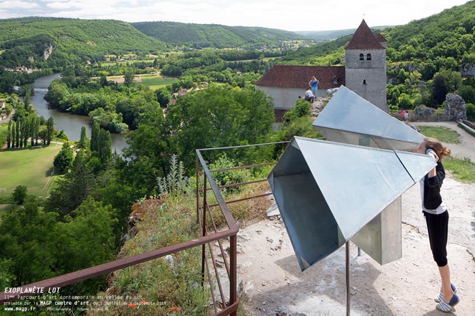 Candiani installed the amplification sculpture pictured here to enable people to listen from the clifftop at Saint-Cirq-Lapopie to the song resonating in the Lot Valley below. You can listen to it here.