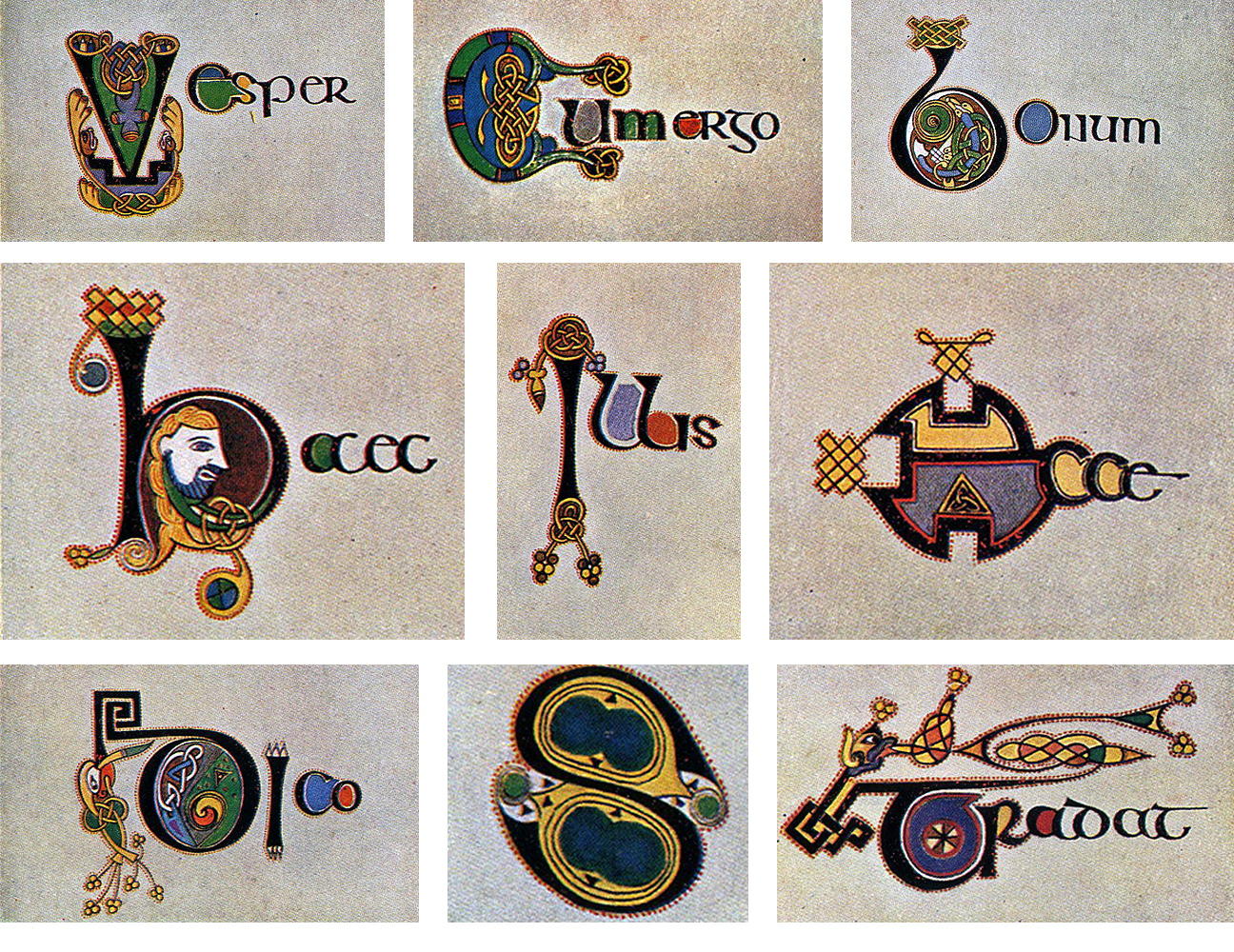 Artist Helen Campbell d’Olier’s reproductions of decorated capitals from the 8th century Book of Kells. The Book of Kells was stolen in 1007 but retrieved after being buried in the ground and stripped of its gold covers. The monks who created it, probably on the island of Iona, relocated to Kells in Ireland after a series of devastating Viking raids.