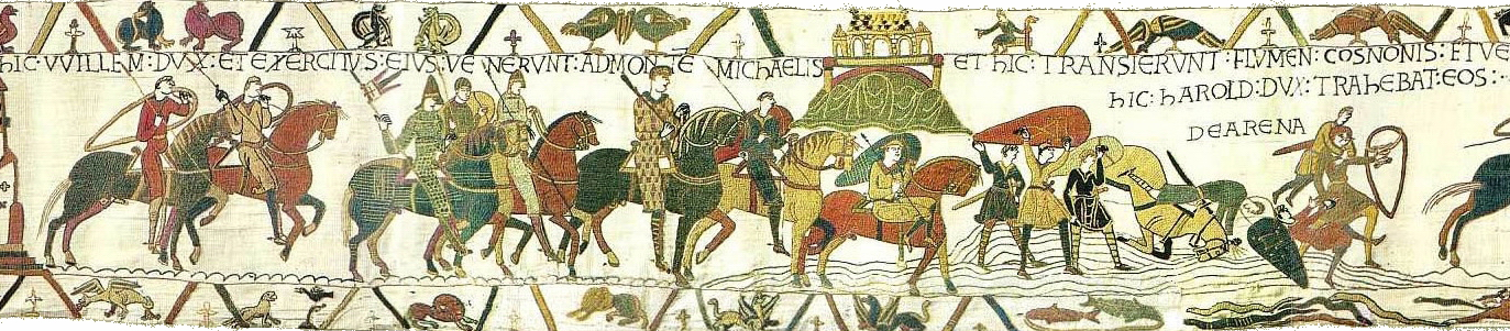 Bayeux Tapestry Scenes 16 and 17: William and Harold at Mont-Saint-Michel (at top centre); Harold rescuing knights from quicksand. By Soerfm – Public Domain, https://commons.wikimedia.org/w/index.php?curid=31051585