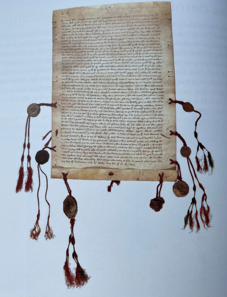 Image below: Will of Count Raimond VII of Toulouse. Parchment and seven wax seals and cords, September 1249. Archives nationales de France, Toulouse.